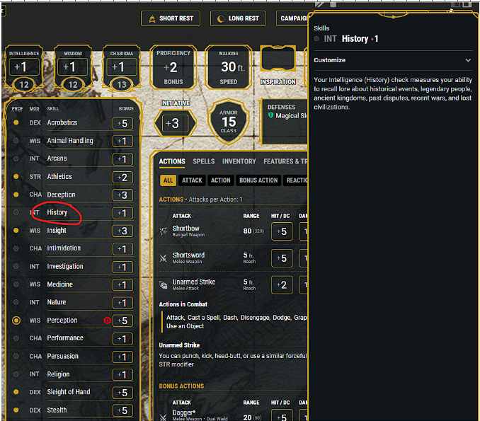 Clickable links can be found for actions, spells, items, feats, abilities scores, saving throws (also featuring a customization dropdown), skills, proficiency bonus, armor class (including a table showing exactly how yours was calculated), speed and most other stats.