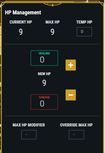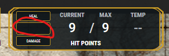 But there’s a bit more. If you click on the “–” under temp hit points, you can type in a number of temp hit points. If you then later enter a damage amount in the Heal/Damage box and click DAMAGE, the sheet will first use any temp hit points you have an take the rest from your current