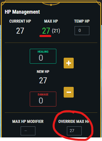 This manual override should be used when leveling up, resting, or any other time the sheet resets your HP to the RAW.